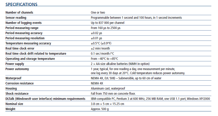untuk pembacaan 3,35 M). Setiap membaca cap waktu, periode, dan suhu. Logger DL-100/200 disertakan dengan