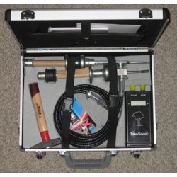 TreeSonic is designed to measure stress wave propagation time in trees in fibre direction. The signal is generated by a hammer tap on the start sensor. By measuring the distance between the two sensors, velocity in fibre direction can be calculated. Fibre direction velocity correlates well with elastic modulus and yield strength of wood. In this way wood material of the tree can be graded before cutting.