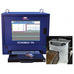 MAC’s new Echomac® PA Wheel Tester is a cost-effective solution for wheel tread inspection or as a prove up tool for shops using automated inspection systems. The test is conducted with a phased array probe incorporated in a hand held mechanical fixture, designed to ensure stable coupling using “bubbler” immersion techniques. Integrated magnets hold the fixture on the tread and provide easy handling.