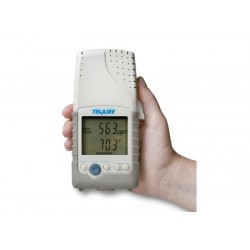The Telaire 7001 handheld carbon dioxide sensor features patented Absorption Infrared technology. Each sensor measures CO2 and temperature and can calculate and display real-time ventilation rates. When combined with the HOBO U12 or ZW Series it can record CO2, and when connected to an analog input on a H22, RX3000, or U30 Series it can record temperature and CO2. The Telaire comes with an adapter but also operates up to 70 hours on 4 AA batteries (not included).